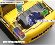 The Komatsu hybrid excavator utilises regeneration of electrical power, engine assist for power on demand, ultra low engine idle and a smaller engine to achieve reduced fuel consumption and lower CO2 emissions.