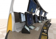 The Dual console is a modular design and is configurable into variable length rows or can be stand alone. The gentle arc of each row, flowing shapes and striking overhead map display “wing” support are both visually elegant and functional. Extensive use of custom aluminium extrusions provides a light and open appearance and visual link with aviation functionality.