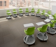 The swivel seat gives students the freedom to shift focus throughout the room without disrupting nearby students. Because the personal worksurface swivels in tandem, books, laptops, and other information remain at their fingertips. It's subtle, but clear sight lines to the instructor, fellow students, and whiteboards, dramatically enhance interaction. The personal worksurface is adjustable, non-handed, and large enough to support digital and analogue resources.