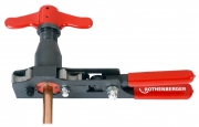 For reliable and fast production of standard single 45° flares on copper pipes Ø 6 - 18mm and 1/4” - 3/4”. Thanks to the patented depth stop & grip protection which prevents the pipe from slipping through the dice and the clutch disengaging at the end of the flaring operation, a leak-proof norm-flare can be guaranteed. The ROTHENBERGER Roflare Revolver is the only flaring tool on the market that can guarantee a norm-flare inside relevant industrial standards. The compact design of the Roflare Revolver means it is suited for working in tight areas like ceiling suspended indoor units. R410A compliant.