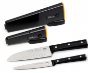 The range features loose knives in three different handle styles, Polypropylene, triple rivet, and stainless steel. Scissors stored in self sharpening scabbards with polypropylene handles are also available. Knife blocks in the range, incorporate the same sharpening and honing technology stored in the block.
